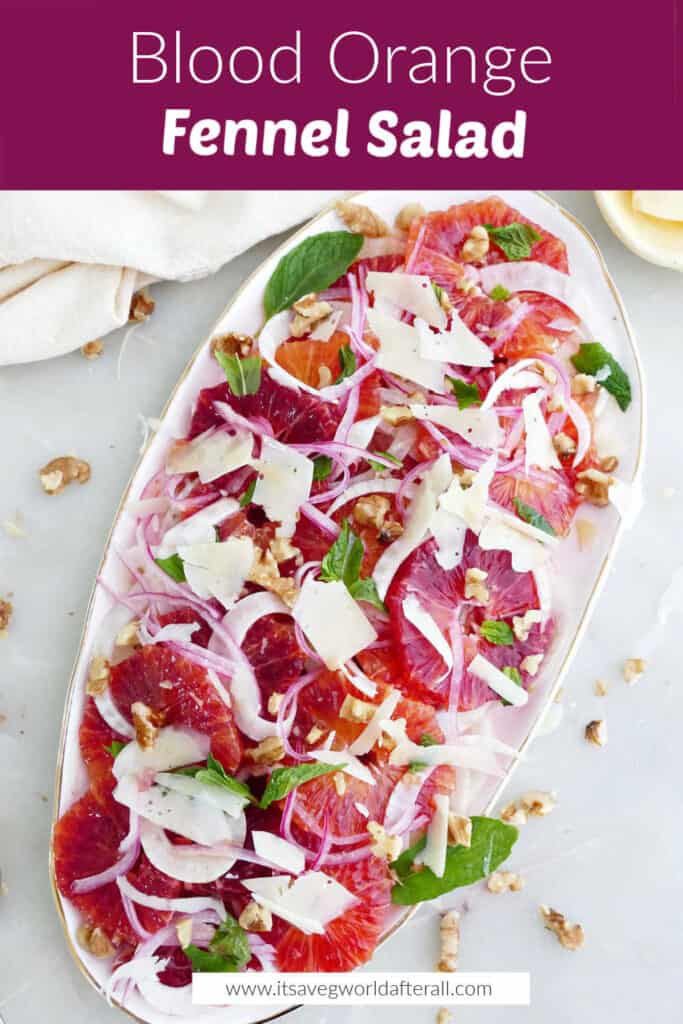 Fennel and orange salad on a tray with text boxes with recipe name and website.