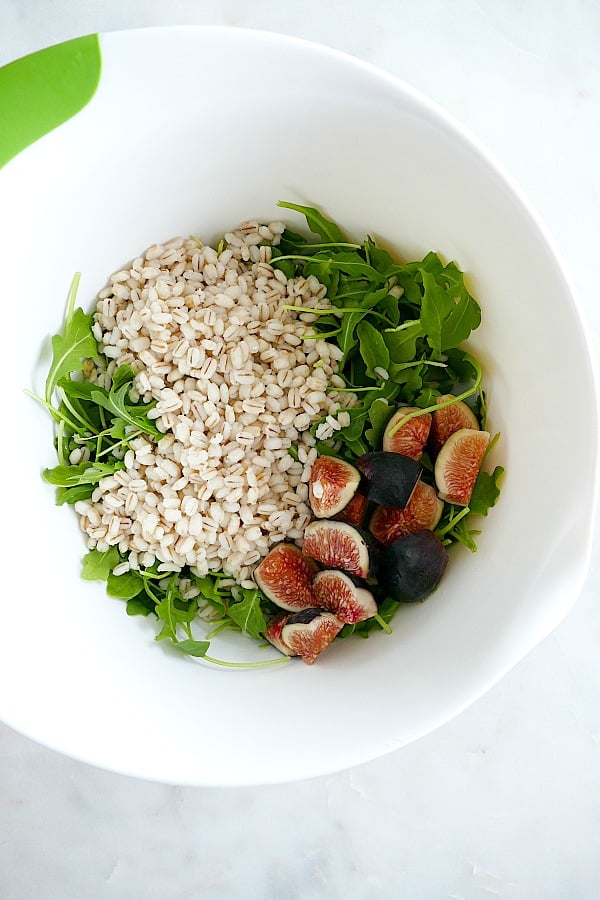 I think you’ll find this Fig and Barley Arugula Salad to be a light, yet filling, fall dish! Serve it as a main course with shredded chicken, lentils, or soft-boiled eggs. It would also be a great addition to a holiday feast or alongside pork tenderloin for dinner.
