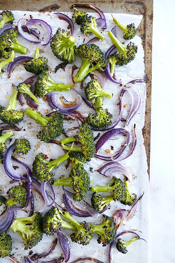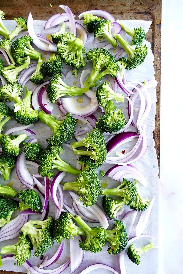 - Prepare the veggies by chopping the heads of broccoli into florets and slicing the red onion into half-moon shaped pieces. Toss the broccoli and onion in the olive oil, garlic, and red pepper flakes. Transfer to the baking sheet.