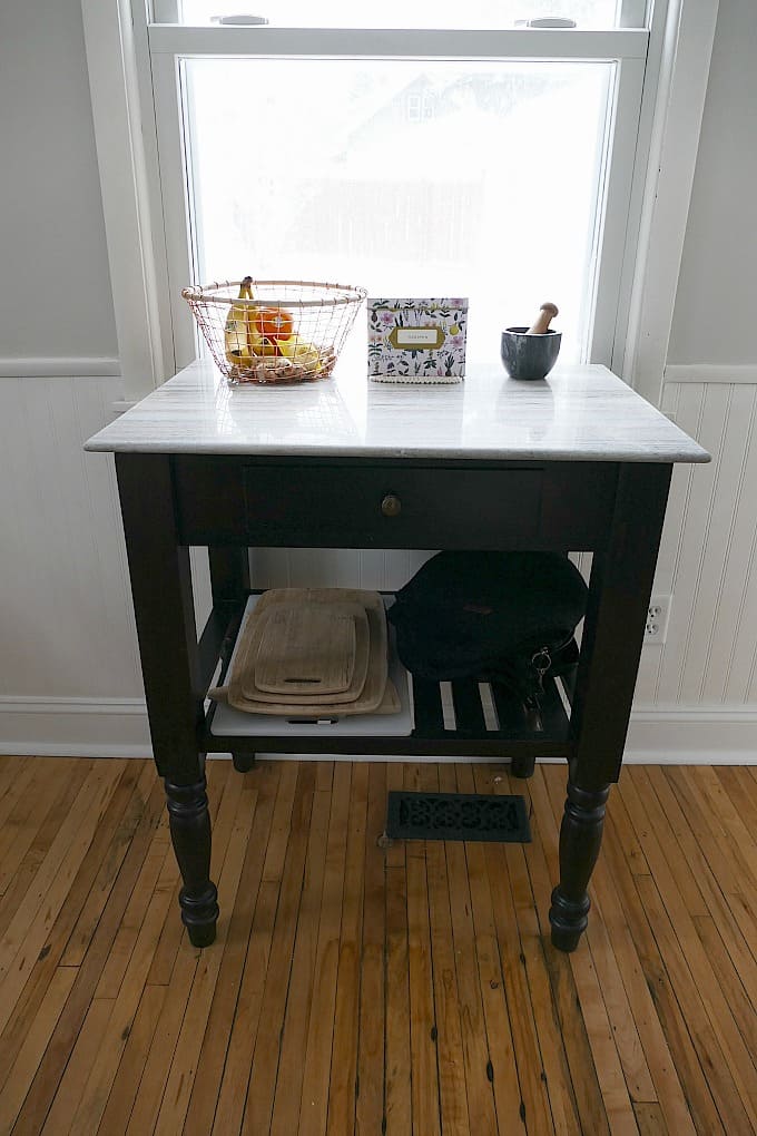 The butcher block was something that the previous owners had in the kitchen, and that Brian negotiated for us to get in the purchase. It fits perfectly in the space beneath the window that looks into the backyard, and it’s actually surface where I take my recipe photos! If you look closely, you can see that it was SNOWING when I took these photos. In APRIL. Classic Minnesota…