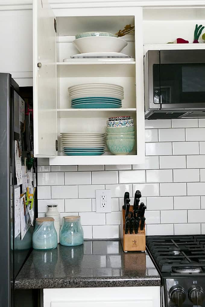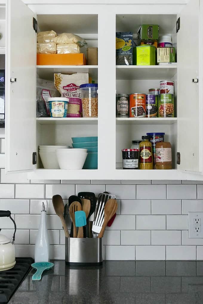 Because of this ideal set-up, the kitchen has exactly what I need without feeling crowded. I can also keep a lot of the counter space clear, which I love! We use the cabinet to the left of the stove for plates, bowls, and serving ware, the cabinet to the right for our pantry, and the cabinet above the dishwasher for some everyday kitchen tools and storage containers.