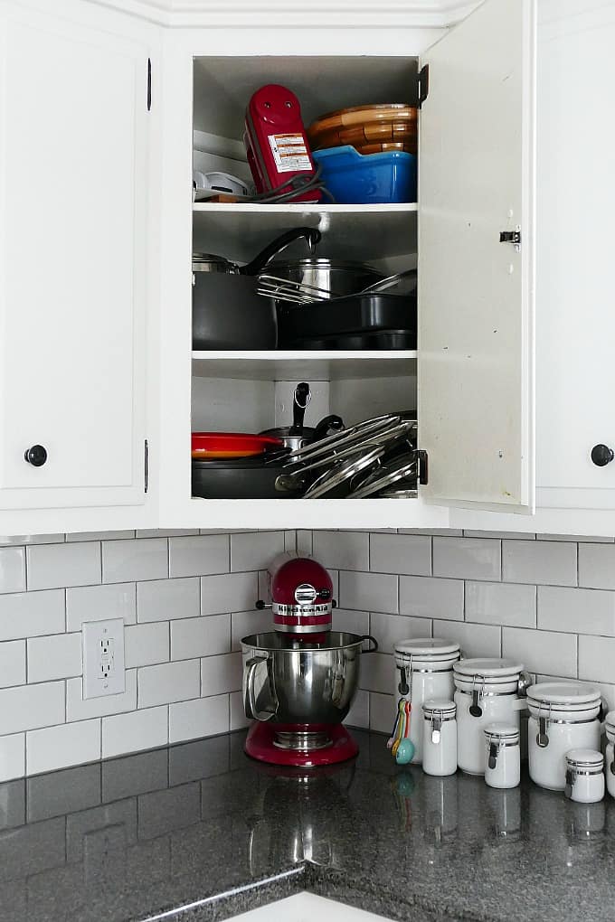 Right above the Lazy Susan is another deep cabinet that fits all of our pots and pans. It’s so nice to have everything organized and right there at my fingertips.