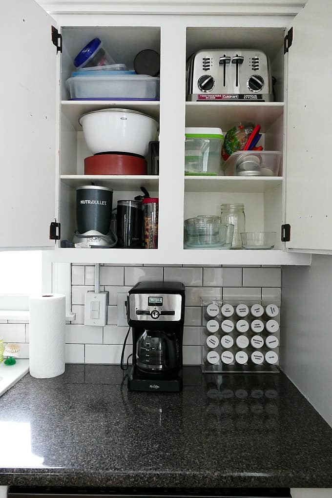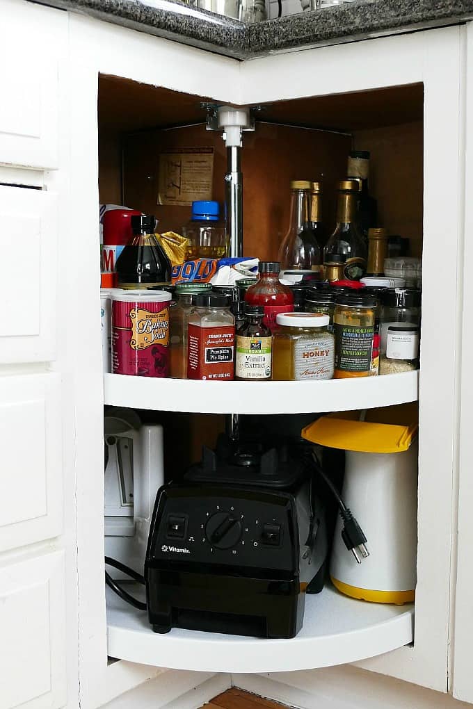 We have tons of deep cabinet space, including a Lazy Susan! Who knew so many things could fit on one of those?! I filled the first shelf with oils, vinegars, spices, and baking ingredients, and the bottom shelf with appliances that I regularly use: the Vitamix, spiralizer, and popcorn maker.
