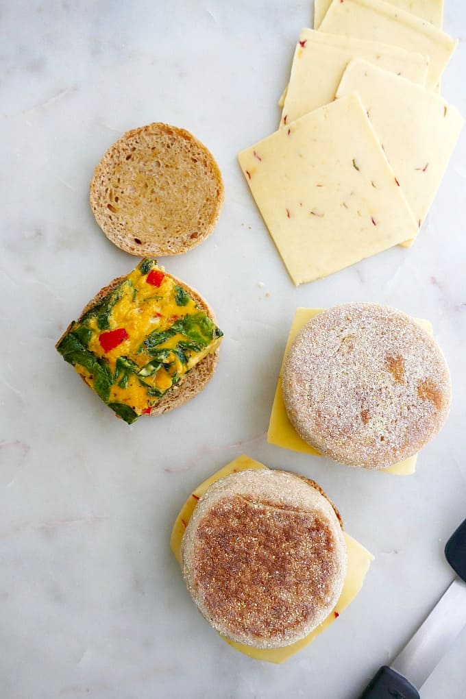 While the eggs and veggies are baking, slice the English muffins and toast them on a baking sheet for 5 to 8 minutes in the oven. Set up an assembly line of the muffins, pepper jack cheese slices, damp paper towels (that are completely rung out), and plastic wrap or foil. The paper towels help absorb water from the ice crystals that melt when you reheat the muffins.