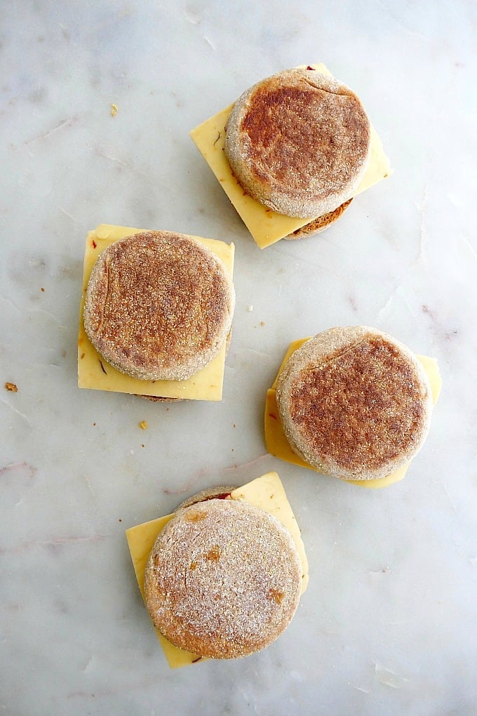 - When the eggs are finished, slice them into 6 pieces. Add a piece to an English muffin and top with a slice of cheese and the muffin top. Wrap each sandwich in a damp paper towel followed by plastic wrap or foil. Label and date if desired. If you are planning to eat the sandwiches within a few days, keep them in the fridge, but otherwise put them in the freezer.